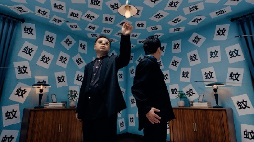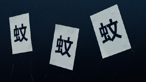 周る「蚊」の文字や壁や天井にとまった(貼りついた?)「蚊」の文字。